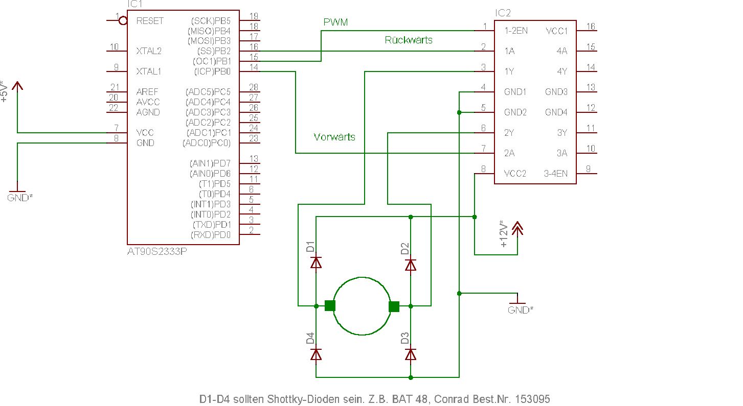 Hi Thorsten! Die AVRs sind eigentlich ganz robust, selbst Kurzschlüsse können die kurzzeitig ab, kann eigentlich nur sein, dass Du mit einen Ausgang vom L293 auf den AVR gehst. Oder in Deiner Schaltung grob was falsch ist (Masse, Versorgungsspannung). Lege zwischen die Ausgänge vom AVR und die Eingänge vom L293 mal Widerstände (um 1k). Vielleicht kannst Du auch erstmal getrennte Versorgung verwenden. Viel Glück, ähm, Erfolg. Nebenbei, wenn der Motor ausläuft (EN off), erzeugt er eine Eigenspannung (Gegen-EMK), die über die Schutzdioden nach Masse und Vs abgeleitet wird. Steigt diese Spannung zu stark an (ab 30-40V wirds kritisch), kann der 78L05 durchbrechen und sie an den AVR weitergeben. Dagegen hilft ein ausreichender Elko (220-470uF) und eventuell Zenerdiode (33V, oder einige V über der normalen Vs) zwischen Vs und GND. Sven