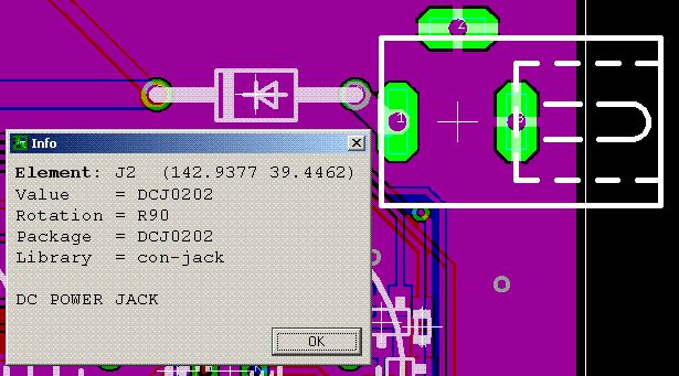 Wolfgang so sollte man es wohl lieber nicht machen. Die Anschlüsse der Buchse sind länglich, nicht rund, daher sollte man Schlitze machen (bei den in den eagle libs definierten bauteilen ist eine Fräsung im milling layer festgelegt). Außerdem macht es keinen Sinn kurz vor der Buchse so eng zu werden mit der Leiterbahn, es sei denn diese Stelle soll als Sicherung funktionieren und bei ordentlich hohen Strom durchbrennen.