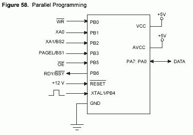 ca. 12 8 Datenleitungen und ein paar Steuerleitungen. Das ist im Datenblatt unter "Memory Programing" und im Handbuch zu STK500 beschrieben.