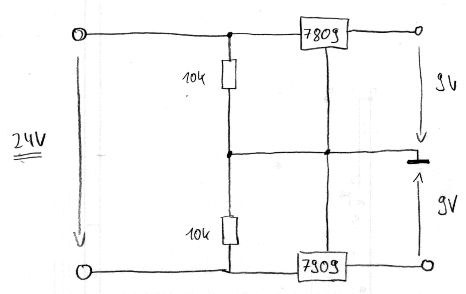 Hallo zusammen, ich würde gerne aus sauberen 24V DC eine symmetrische Spannung erzegen von +/- 9V. Ich habe mir anbei folgende Schaltung ausgedacht. Würde das so funktionieren? (Kondensatoren zur Glättung sind aus Gründen der Übersichtlichkeit nicht eingezeichnet!) Danke excelsior