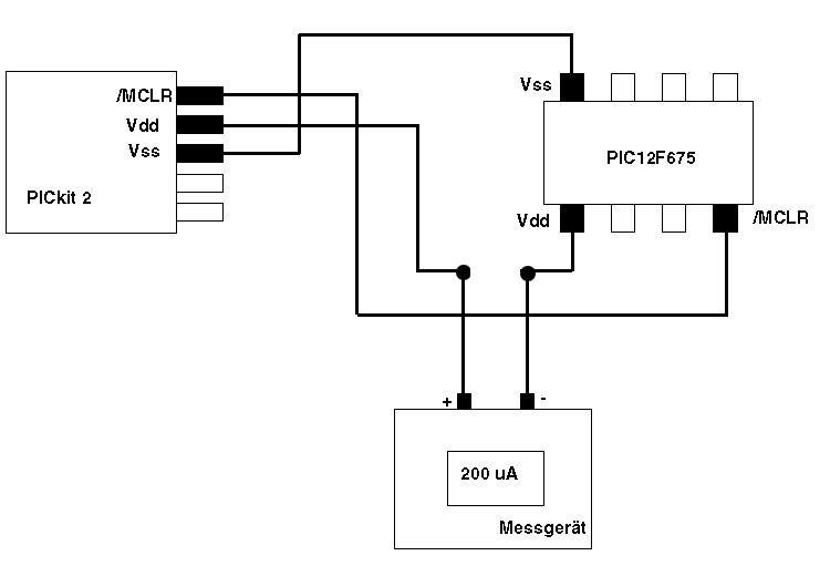 Hallo ich habe eine einfache mess-Schaltung augebaut, um zu sehen, wieviel Strom ein PIC12F675 unter bestimmten Bedingungen verbraucht. Dabei ist mir aufgefallen, dass auch Strom fließt, wenn der Controller ganz ausgeschaltet ist (/MCLR low). Je nach Spannung fließen einige 100 µA, also weit mehr als etwa im Sleep (10 µA). Ich habe verschiedene Konfigurationen (PWRTE_, BODEN_, etc ON/OFF) probiert, alles mit dem gleichen Resultat. Am Programm selbst kann's kaum liegen, und die Pins werden ja auch erst nach dem Start konfiguriert. Im Datenblatt habe ich dazu leider nichts gefunden, sämtliche Angaben beziehen sich auf Normalbetrieb und Sleep, es gibt keine Tabelle zum Verbrauch im Reset-Zustand mit /MCLR low bzw bei zu geringer Spannung zum starten. Wie kann das sein? Und kann man das vermeiden?