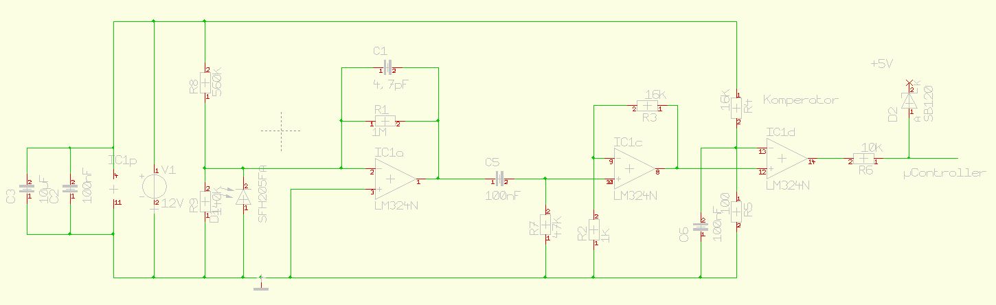 Ich habe mal meinen aktuellen Schaltplan eingefügt. Der Ausgang beträgt des TIA beträgt ca. 0V. Wenn ich mich mit einem Feuerzeug melde, schlägt er aus, wenn ich ca. 5cm entfernt bin. Die Umgebung für den Einsatz ist ein normaler Wohnraum. Wenn ich alle Lichter anmache (Halogentstrahler + Energiesparleuchte) messe ich keine Spannung am Ausgang. Da heute mal wieder ein trüber Tag ist, kann ich nicht bezüglich der Sonneneinstrahlung sagen. Das IR-Licht der Sonne sollte im Bereich von 950nm aber auch nicht durch das Fensterglas kommen. Sonstige IR-Quellen wären Fernbedienungen für TV usw. sowie eine IR-Tastatur. Signale von Fernbedienungen sollte ich aber durch die Software ignorieren können. Ich schließe daraus, dass ich R1 des TIA vergrößere. Auf dem Schaltplan ist zudem ein HP eingezeichnet. Diesen habe ich schon am allerersten Versuch eingebaut gehabt und da hat er funktioniert. Ein HP 2.Ordung mit dem OP wäre wohl besser zum Filtern !? Zur Sendefrequenz: Diese könnte ich problemlos auf 2kHz erhöhen, falls der kleine Sprung was bringen sollte. Mein (Sende-) PIC läuft nur auf 32kHz. Wenn es für die Übertragung sehr viel besser wäre, dann wäre es ne Überlegung wert, ob ich ihn mit 4 Mhz takte um die Sendefrequenz zu erhöhen. Ich würde es dennoch bevorzugen, die 1 kHz Übertragung zu nutzen, um die Software nicht nochmal zu überarbeiten und die Stromaufnahme des Sende-PICs niedrig zu halten. Den Strom durch die (Sende) IR-Diode würde ich eher später ändern, um die Reichweite anzupassen.