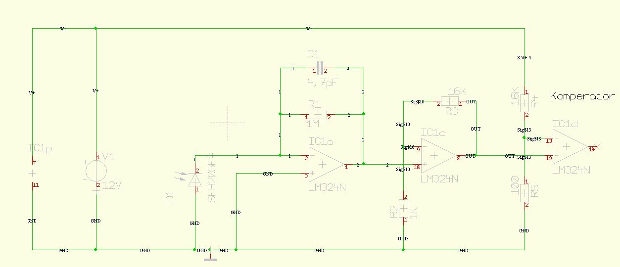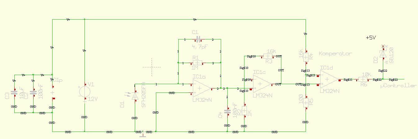 Kondensatoren sind nun dran. Als Messgerät hab ich nur ein Multimeter. Das Signal am Komperator+ ist bei wenigen Milivolt und springt kurz hoch, wenn ich mit der IR-LED auf die Photodiode blinke. Am Komperator- liegen 65mV an (ist ein Poti dran, nicht die zwei Widerstände aus dem Schaltplan). Zudem ist ein kleiner C gegen Masse dran. Der Ausgang macht mich stutzig. Dieser hat im Ruhezustand schon einen Pegel von 1,2V. Bei der Beleuchtung mit IR-Diode springt das Signal. Mein µC bekommt aber kein richtiges Signal. Den OP hab ich schon gewechselt - der sollte ok sein. edit: Danke für deine Geduld