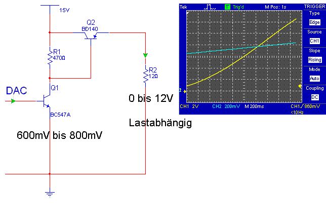 naja, Solch ein gerede ist mir zwar Egal jedoch im Anhang siehst du eine Schaltung wie es geht, ich weiß dass es Lastabhängig ist und man auf der Kennlinie nur "rumrutscht" jedoch Funktioniert sie und sie kann auf eine Last Angepasst werden. Wie gesagt es geht natürlich mit einem OP Schöner. Garkeine Frage. Jedoch Funktioniert auch diese Version. Habe es gerade noch schnell auf ein Steckbrett aufgebaut .. Bin erst vor paar min wieder nach hause gekommen. Als DAC habe ich einen DAC8512 genommen da ich den gerade aufgebaut hatte. (12 Bit) normal nutze ich den AD 5320 jedoch habe ich nun eben den DAC in betrieb gehabt. Das Oszibild ist von einem TDS2024. Nochmal. Ich weiß das es keine schöne Methode ist. Jedoch Fakt ist es geht!