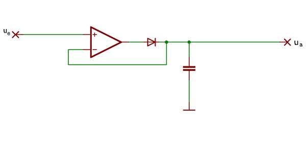 Bei deinem Spitzenwertgleichrichter bekommst du immer denn hoechsten Spitzenwert deines Signales allerdings ist der Abfall der Spannung so erstmal nicht gegeben -> Du brauchst noch irgendeine Entladeschaltung fuer dein C im einfachsten Fall einen Widerstand parallel dazu. >Was ist eigentlich bei deinem Addierer der Unterschied zum >Impedanzwandler? Die Schaltung macht halt beides gleichzeitig. Erstmal die beiden Signale addieren ohne das das eine Signal ins andere ueberspricht. Zum zweiten die Impedanzwandlung auf grund der Tatsache das der Eingangswiderstand hier 100K bertraegt und der Ausgangswiderstand der gegengekoppelten OP Schaltung einige Ohm. Gruss Helmi