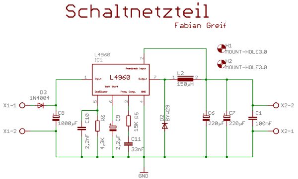Hi Leutz, ich habe ein "Schaltnetzteil" mit einem L4960 nach einem Vorschlag von Fabian Greif (kreatives-chaos.com). Netzseitig ist ein Trafo era vorhanden: 2,3VA, 9V, 256mA. Wenn ich die Schaltung in Betrieb nehmen mit Last (µC Mega32 + GLCD) dann läuft das Netzteil nicht richtig an, Spannung bleibt bei ~ 1,8V. Ohne Last ist es kein Problem, Stecker rein und dann erst µC Board angeschlossen. Hat jemand ne Idee was das Problem sein könnte? Hat der Trafo vielleicht zuwenig Power? Gruß - Markus