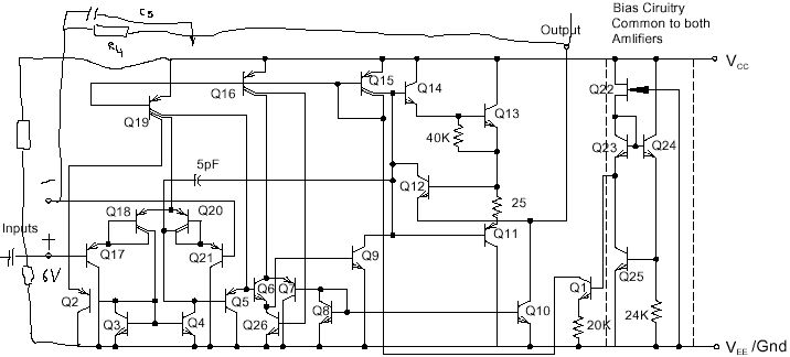 Hm.... bei XC = 1/j omega C => XC = 1 / (2 PI f * C )= 1 / 6.28 * f 10 10^(-9) F. Mit F = Farad XC=1/(0.0628 * 10^(-6) * f ) bei f=0 unendlich bei f=1KHz XC=15KOhm bei f=15KHz XC=1KOhm bei f=40KHz XC=398 Ohm Wenn ich mir also Vorstelle, daß C5 irgendwann zum Draht wird, dann geht der Eingang dirket auf den Ausgang und zwar unverstärkt. Ist aber nicht richtig Geil gesiebt , oder ????