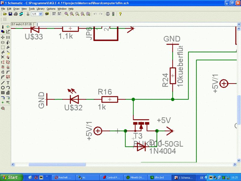 Moin, ich habe versucht ein LCD und ein paar LED per uC ein und aus zu schalten. Ein Relais wollte ich dazu nicht benutzen. Hier im Forum hab ich den Hinweis auf den BUK100-50GL gefunden, der so weit ich das verstanden habe dafür ideal ist. Wie ich ihn beschaltet habe ist auf dem angehängten Schaltplan zu sehen. +5V ist die Versorgung und wenn ich 5V an den Input Pin lege dachte ich der schaltet durch, so daß das am Netz +5V/1 angeschlossene LCD auch 5V bekommt. Aber leider klappt das nicht ganz. Wenn ich das ganze unbelastet ausprobiere liegen auch 5V an dem Pin, an den das LCD soll, an. Sobald ich es aber anschließe bricht die Spannung auf 3,3V zusammen. Leider weiß ich nicht wiso, reichen die 5V nicht aus um den FET bei einer Belastung zwischen 100 und 200mA voll durchzusteuern? Und wenn ja wie kann ich mein Problem dann lösen? MfG Mike