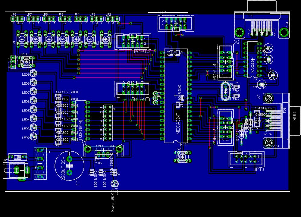 hi! - Oben schief hatten wir ja schon - Der Quarz ist ziemlich weit weg vom µC. - IC2 = 7905 ??? - X2 könnte noch ein parr Brücken für den Hardware Handshake vertragen. - C6 Bring da nicht viel -> näher an den Regler - Kann man S1 gut bedienen (Höhe J1 <-> S1)? - Befestigungslöcher? - Alle Pin1 Lötaugen anders machen (rechteckig) - Pullup für Rest vorhanden? - JP11 gut erreichbar? (Höhe Port-1 und µC wenn gesockelt?) - Haben alle Pfostenstecker immer an den selben Pins GND/5V? - Oberleitungen an Port-1 sind relativ eng.... Sonstiges: - C7 C8 und C10 könnten eine reihe bilden - GGF sollte der MAX232 vom Port4 trennbar sein (Jumper?) - Per Jumper zuschaltbare Pullups für den I2c - Wenn ADC genutzt: was ist mit 100n an AREF / 10µH+100N an AVCC - Wenn Überall die gleichen Flachbandkabel genutzt werden sollen, dann die Pfostenstecker so drehen das die Kabel immer schön nach aussen zeigen (I2c-1 vs PORT-3,....) mehr fällt mir im Moment nicht ein... Wozu brauchst du das Board? Zum testen oder für was Spezielles?