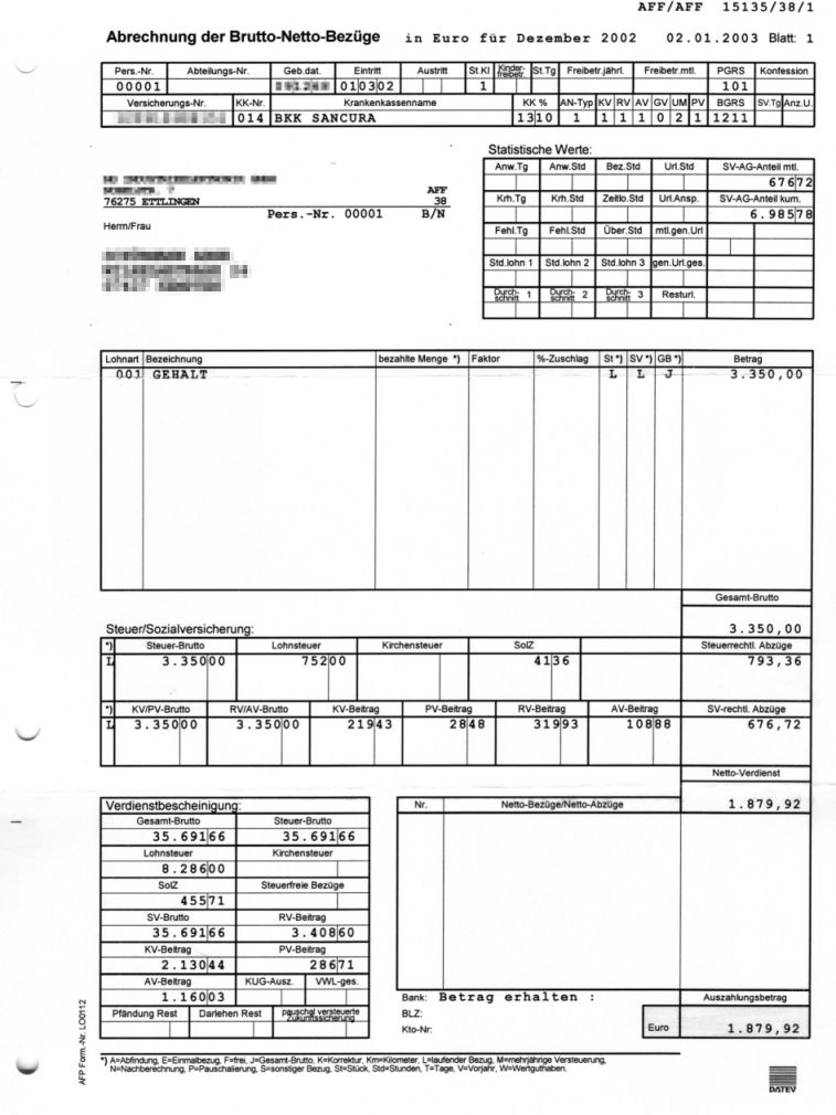 Arno Nühm schrieb: > Mr.T schrieb: >> Diese 40/44k€ beziehen sich auf wieviele Jahre BE? > > Ausbildung + 4 Jahre BE TK-Anlagen, Netzwerktechnik > Studium NT + 2,5 Jahre BE Entwicklung HF, Analog und Mikrocontroller Ich finds erbärmlich mit wieviel man Dich abgespeist hat. Hab mal einen Gehaltszettel von anno 2002 (Zweitausendzwei!) eingesannt. War ne Ing-Klitsche. Fürs Jahresbrutto addierst Du noch 2x 3150,- drauf, da ich erst im März dort angefangen hatte - gab zur Jahresmitte eine Erhöhung um 200,-. Und das war ein eher durchschnittliches Gehalt damals.
