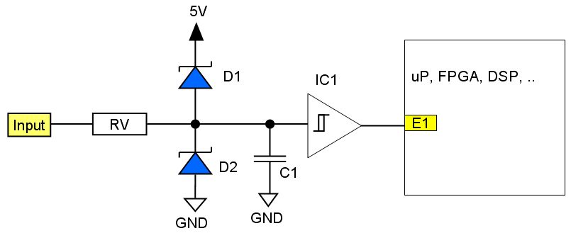 Hallo Bernd Danke für Eure Tipps. @Bernd: Das klingt ja recht aufwändig. Du schreibst von xxx116 Leitungsempfänger. Kannst du mir bitte ein konkretest Beispiel eines solchen Bauteiles nennen. @DAC: Verstehe ich richtig, du würdest für jeden Eingangskanal einen DAC verwenden. Und am Eingang wird ein Spannungsteiler vorgeschaltet. Welche Aufgabe hat dieser dann bitte? Die 50V herunter zu teilen? Vorgespannte Dioden?? Mir ist klar, dass Dioden eine parasitäre Kapaziät haben, welche eine Tiefpasswirkung ergeben. Muss man hier einen Trick anwenden? @Falk: Du würdest demnach nur einen Schmitt-Trigger einsetzen. Und wie hanelt man bitte die hohen Spannungen? Viele Grüsse FPGA-Lernender
