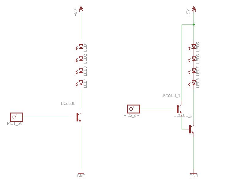wobei UA die Ausgangsspannung des PIC (5 V), UBE die Basis-Emitter- Durchlassspannung des Transistors (ca. 0,7 V) und IB der gewünschte Basisstrom (1 mA) ist. Die Idee von Matthias, an Stelle des Basis- und des LED-Vorwiderstands einen Widerstand zwischen Emitter und GND zu nehmen, ist prinzipiell sehr gut, da damit der Stromfluss durch die LEDs weitgehend unabhägig von der Betriebsspannung ist und sogar ein Widerstand eingespart wird. Allerdings funktioniert sie in deinem Beispiel nicht, da damit die maximale Spannung an den LEDs nur