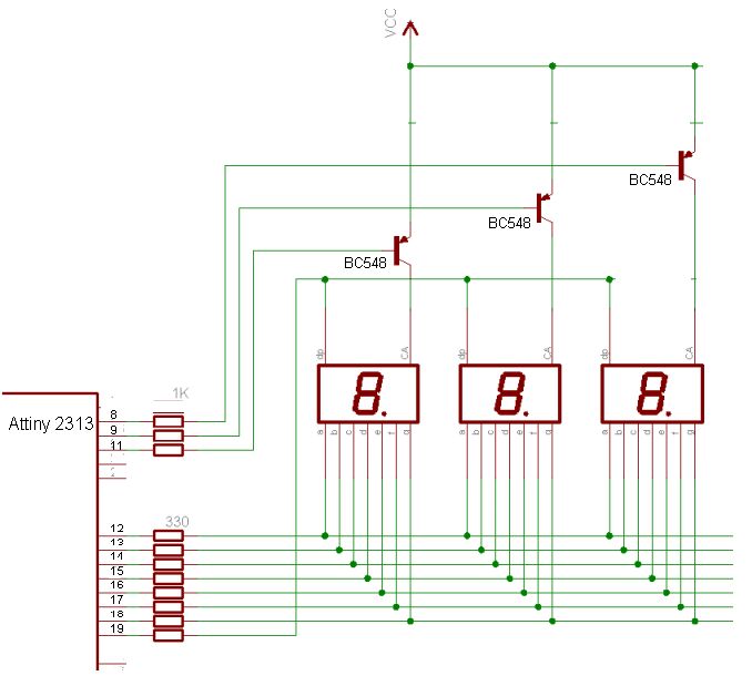 Hallo nochmals. Ich verwende NPN Transistoren (BC548). Angeschlossen über 1K an den jeweiligen Port. Anschluss wie im Tutorial auf mikrocontroller.net "AVR-Tutorial: 7-Segment-Anzeige" MfG Dominic