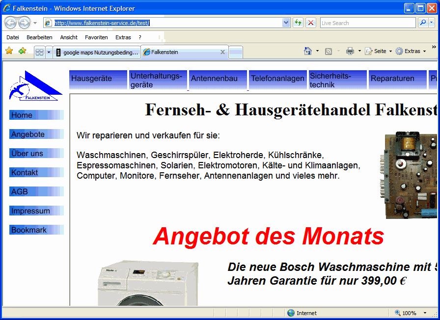 Als Auftraggeber für diese Seite würde ich auch nicht wegen google.maps, sondern wegen ganz anderer Sachen Stress machen. Wie schon erwähnt, sind auf Briefmarkengröße skalierte 400kB Bilder ein extrem schlechter Stil und absolut vermeidbarer Anfängerfehler. -> nachbessern. Für Iframes brauchst du schon verdammt gute Gründe um die einzusetzen. Im Moment zerschießt dir dein Iframe eher das Layout, als dass es das bewirkt, was du dir erhofft hast. Und Suchmaschinen haben deshalb auch keine Freunde an der Seite. Wenn du von Anfang an einen WYSIWYG-Editor verwendst, wirst du die selben Fehler immer und immer wieder machen. Deshalb leg den Dreamweaver erstmal beiseite und setz dich mit den Grundlagen von HTML auseinander. Mehr als einen einfachen Texteditor braucht man nicht um eine gute Seite ins Netz zu stellen!