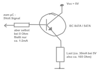 Hi, ich brauche ein wenig Hilfe und hoffe, dass sich jemand erbarmt. Durch einen Platinenfehler, nein falsch: durch einen Denkfehler :-( habe ich leider einen Schalttransistor als Kollektorschaltung / Emitterfolger aufgebaut. Siehe Bild anbei. Eigentlich sollte auch das ja kein Problem sein, da ich keine Spannungsverstärkung, sondern nur eine Stromverstärkung brauche = Eingang und Spannung sind 5 Volt. Nur leider erhalte ich statt 5 Volt Output nur ca. 4,3 Volt, was leider zu wenig ist. Transistor ist ein BC547A. Was kann ich tun um die Ausgangspannung hochzubringen? Wie gesagt, Platine steht schon und kann nicht so einfach geändert werden. Danke