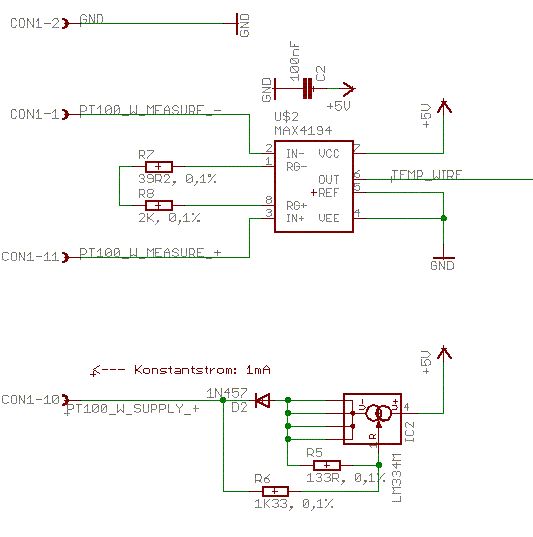 Hallo! Ich wollte mit der im Anhang zu sehenden Schaltung eine PT100-Temperaturauswertung bauen. Dabei sollte das Prinzip des Vierleitersystems genutzt werden - also ein Konstantstrom von 1mA durch den PT100 schicken und über separate Leitungen den temperaturabhängigen Spannungsabfall messen und Verstärken. Als Verstärker hatte ich mir den MAX4194 ausgesucht und ihn so beschaltet, das die Verstärkung bei 25,52 liegt um die PT100-Spannung möglichst gut für die spätere Auswertung durch den Mikrocontroller (Atmega8) vorzuverstärken. Allerdings funktioniert es nicht. Die Stromquelle liefert schön ihren 1mA Konstantstrom, am MAX4194 kommt auch die entsprechende Spannung an, aber am Ausgang leider kein verstärktes Signal. Hier mal ein paar Messwerte, die ich beim Testen mit Serienwiderstänen aufgenommen habe: R = 150 Ohm | Uin = 0,171 V | Uout = 0,294 V | -> V = 1,72 R = 100 Ohm | Uin = 0,118 V | Uout = 0,195 V | -> V = 1,65 R = 80 Ohm | Uin = 0,097 V | Uout = 0,157 V | -> V = 1,62 Wie man sieht, ist die Verstärkung meilenweit von den angestrebten 25,52 entfernt und zudem nichtmal konstant. Ich habe keinen Schimmer woran das liegen soll. Das Uin und R nicht absolut proportional sind, könnte am Messaufbau liegen (viele Strippen und so), aber trotzdem sollte die Verstärkung zwischen Ein- und Ausgang des MAX4194 konstant sein... Falls jemand da Rat weiß. wäre ich sehr dankbar!!! Gruß, André edit: Das Datenblatt des MAX4194: http://datasheets.maxim-ic.com/en/ds/MAX4194-MAX4197.pdf