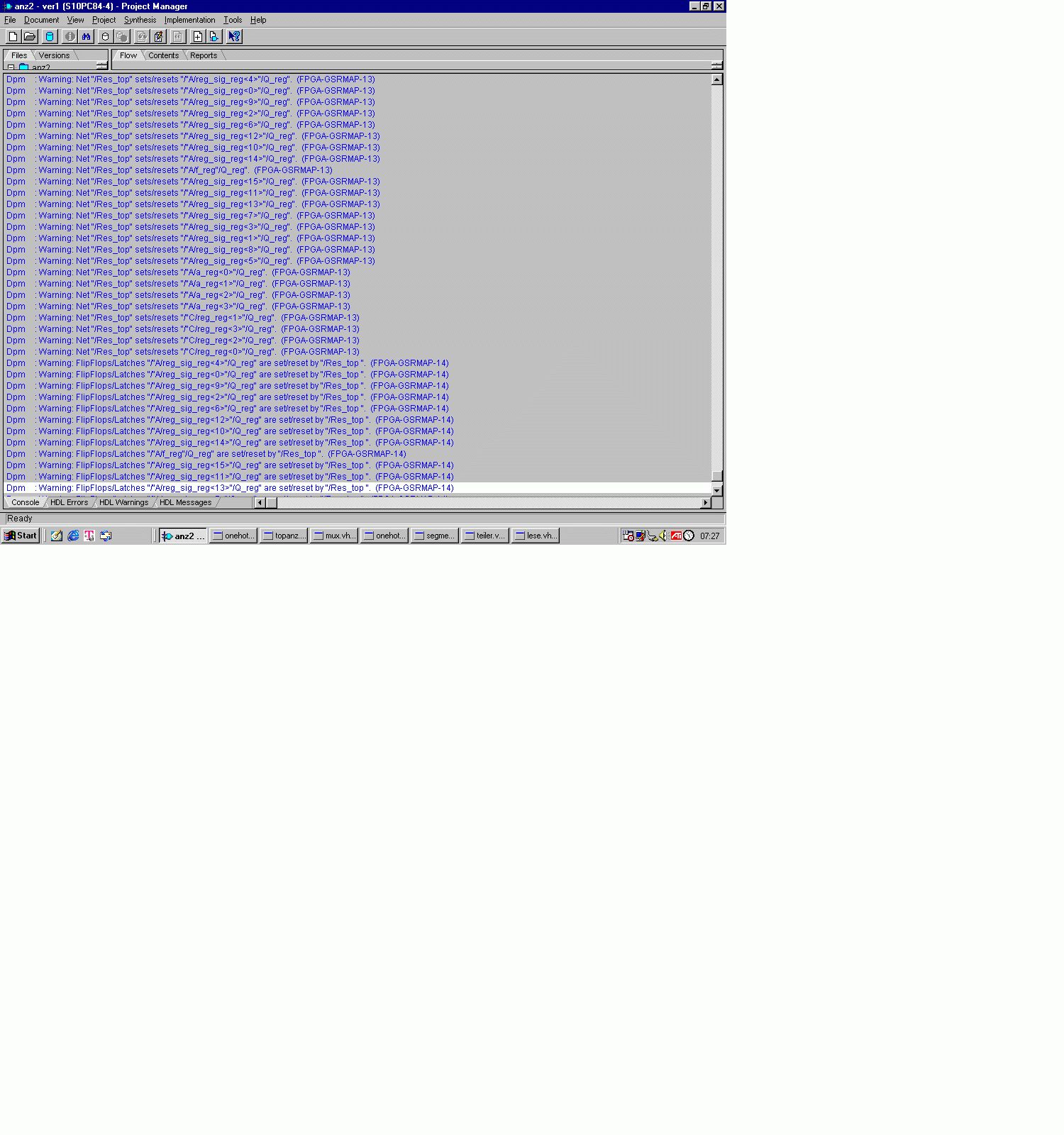 Ich kann mir aber kaum vorstellen, dass sich jemand traut ein Tool mit einem solchen Fehler rauszugeben. Ansonsten ist evtl. gemeint, dass die Set/Reset Signale asynchron arbeiten, was wenn möglich vermieden werden sollte und evtl. vom gewählen Device gar nicht unterstützt wird. Der Grund ist, dass ein beliebiges Timing des Reset-Signals im Vergleich zur Clock dazu führen kann, dass nach dem Loslassen des Reset sofort eine Taktflanke kommt und die Timing-Bedingungen der Register verletzt, und das System deshalb nach einem Reset in einen unerwarteten oder sogar Metastabilien Zustant kommen kann. Besser ist es deshalb, das Reset-Signal durch ein, zwei getaktete Register laufen zu lassen (Synchronizer) und danach als synchronen Reset zu verwenden, also statt