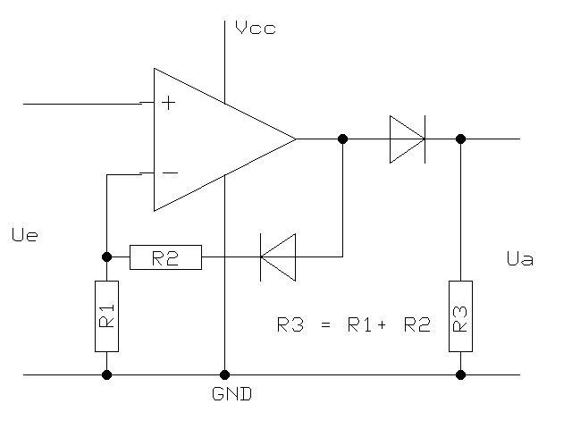 Hi! LM358 ist schon der richtige Ansatz. Rail to Rail ist auch nur eine Werbewirksame Angabe, das bedeutet nicht das er wirklich bis an Vss oder Vdd rankommt. 50-100mV fehlen immer. Beim LM358 ist unten bei ca.70mV Schluss, nach oben leider schon eher. Wenn du also 5V zu Verfügung hast und Ua max 3,5V betragen soll, geht der LM358 mit einem kleinen Trick hervorragend. Der Trick ist eine Doppeldiode die im Gegenkopplungs und im Ausgangspfad hängt.(Doppeldiode wegen gleicher Betriebswerte). Übrigens sollte die Eingangsspannung eines normalen OV nicht näher als 0,7V an die Ub-Grenzen geraten. Werde mal schnell eine Skitze anhängen. MFG Uwe