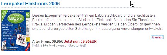 Hab auch nicht alles durchgelesen. Wie meinem Vorredner liegt es mir fern einen Shop zu denunzieren oder hier nur Dampf abzulassen. Was mich aber sehr stört ist die Tatsache, dass Bücherbillig.de seit Monaten das Buch >EMV-Design Richtlinien >9,95 € statt 49,95 € bewirbt obwohl es nicht Lieferbar ist. Nachdem ich im Juni drei mal einem (sicher auch euch bekanntem) Anzeige-Link nachgegangen bin um mir das Buch zu kaufen und jedes Mal auf eine Leere Shopseite gelangte, hat es mir gereicht und ich habe versucht dort anzurufen. Nach mehreren Versuchen über zwei Tage ging dann die (wahrscheinlich selbe) Frau wie bei Alexander U ans Telefon und erklärte, das Buch sei gar nicht mehr Lieferbar. Auch in Zukunft nicht. Sie sagte auch, das wäre dem Admin mitgeteilt worden und der Link werde verschwinden. Was er bis heute nicht getan hat. >ist doch beruhigend zu lesen, dass es auch Anderen so geht wie mir, was nicht >heissen soll, dass ich das schoen finde ;) So sehe ich das auch. Konsequenzen muss dann jeder für sich selbst ziehen.