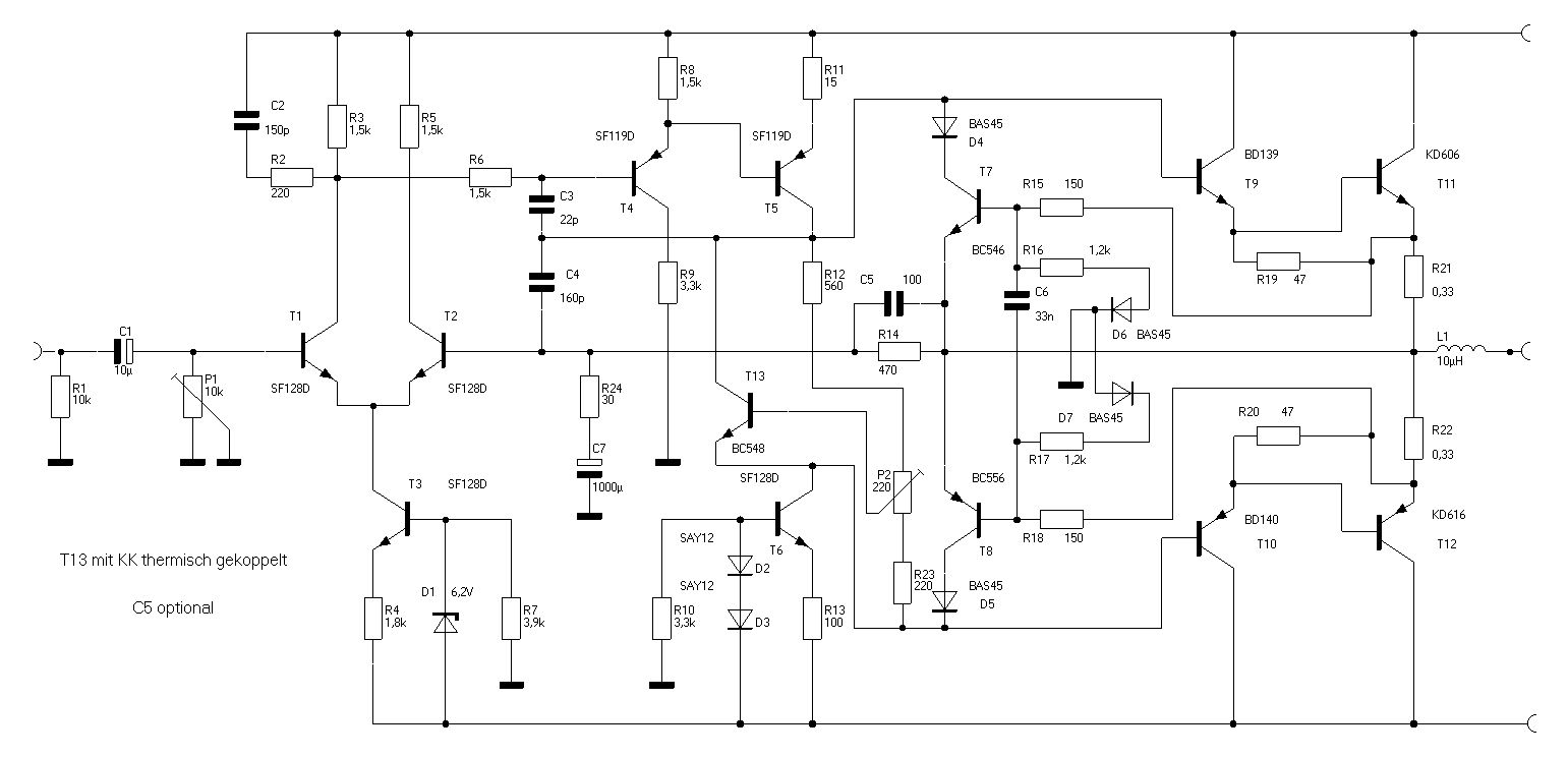 Hallo Leute, ich habe da mal eine Bitte, erklärt mir mal wie diese NF Endstufe genau funktionieren soll. Ich habe den Schaltplan von 2 Platinen reverse engeneered, die ich mal von einem Opa bekommen habe, der dabei war seinen ganzen Bastelkram im Elektronikschrott zu entsorgen. Das interessantere Zeuch war die sehr gute Literatur die ich mit geerbt hatte und jede Menge Transistoren auch Germanium, alle ausgemessen und auf Lochkarten (!) sortiert, DDR ICs, dito sortiert, Potis, Schalter, Spulenkörper, Schätze halt. Es gab auch jede Menge selbst konstruierte Platinen für Syntesizer, Mischpulte und Eigenbauradios.. Unter anderem gab es auch 2 Leiterplatten mit diesem augenscheinlich von dem Vatel selbst konstruierten NF Verstärker. Das Ding geht soweit ganz gut hat aber IMHO 2 Probleme: 1. das Teil ist nicht temperaturstabil, R12 sollte durch die bekannte Schaltung mit einem thermisch gekoppelten npn Transistor auf dem KK ersetzt werden und 2. was hat der sich bei dieser Endstufe gedacht? Ich hätte die Emmitter von T7 und T8 zusammengeschaltet, daran die Basen von T9 und T10 und diese mit z. Bleistift 6,8 Ohm mit den Emittern verbunden und von da die Gegenkopplung nach vorne gezogen. Sehe ich das richtig, daß hier das Potential an R15/R16 im Nulldurchgang über 2 UBE springen muß? Übernahmeverzerrungen habe ich keine gesehen... erzählt mal Eure Meinung. Gruß, Holm