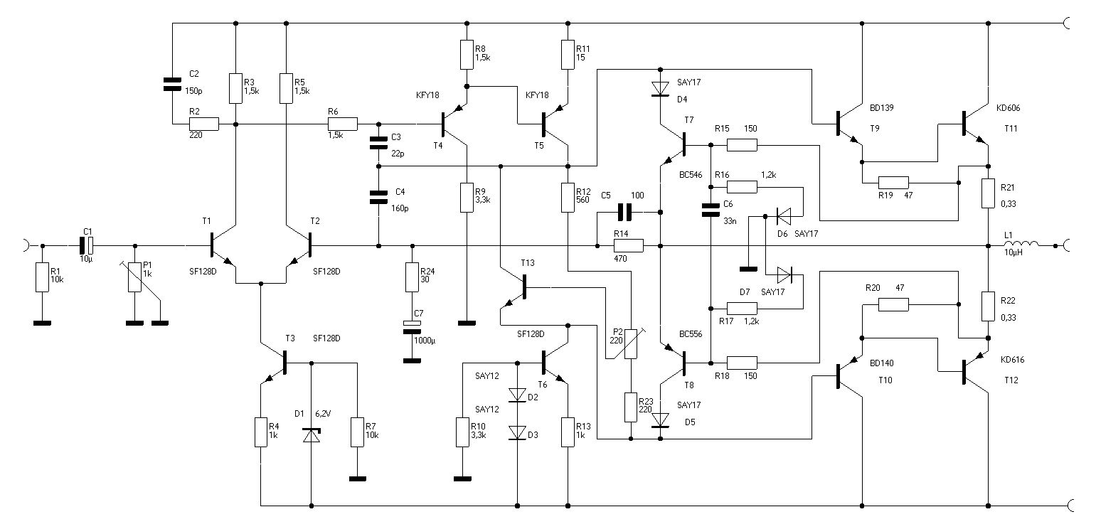 Hallo, wenn Du noch uralte Radio-Fernsehen hast, irgendwann so um Ende Ende 70er/Anfang 80er gab es mal einen Artikel in der Art "neuartige Konzeption für Endverstärker". Das alles leider ohne Garantie... Merkmale: ein A109 und diverse komplemtäre Transistoren und viele Dioden. Endstufe selbst Quasi-komplematär. Dauerkurzschlußfest, keine Einstellungen nötig, keine Transistorpärchen nötig. Ich habe das Ding damals mehrmals aufgebaut, meist 25W Sinus mit 2N3055 oder KU606 drin, einmal auch mit 100W (96W gemessen). Klirrfaktor war mit der Ungarn-Kiste nicht nachweisbar, der Generator klirrte mehr (also unter 0,1% über den ganzen Frequenz/Leistungsbereich). Ich suche diese Schaltung (aus Nostalgie-Interesse schon lange, habe da selbst nichts mehr und Bibliotheken, wenn man nicht genau weiß in welchen Heften...). Mit A109 und 2N3055 ist sie völlig unproblematisch, mit µA709 muß die OPV-Kompensation geändert werden, mit KU606 mußten je 10n zwischen BC an die KUs, sonst war es ein 100W Sender auf ca. 4MHz... Paßt zwar nicht so direkt zu Deinem Thema, aber vielleicht hast Du ja alte Zeitschriften aus DDR... Gruß aus Berlin Michael