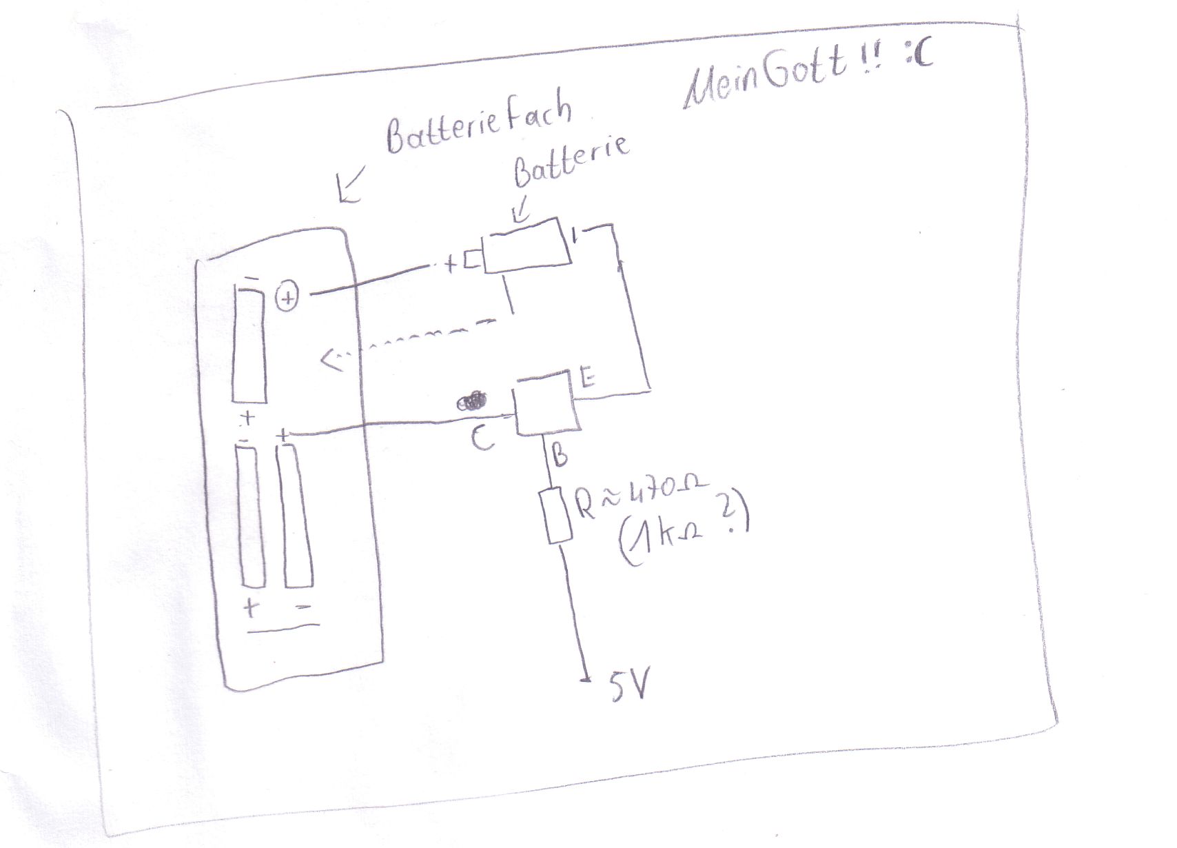 1. Jetzt ist dein Bild doppelt so groß - ohne neuen Inhalt. Meines hatte 10k und das von Jochen nur ein paar Byte! Bildformate 2. Wo ist der Motor? 3. Ich fürchte, du musst an beide Batteriepole herankommen, ausser du nimmst noch eine extra zum Ansteuern der Basis. 4. Gegen welchen Punkt sind die 5V Ansteuerung? (Minuspol der 5V?) 5. Was soll die extra Batterie ausserhalb des Batteriefachs bzw. was ist in dem Batteriefach? Auch eine Batterie? Nur der Motor? Der Motor und eine Batterie? 6. Welchen Transistor stellst du dar? Es gibt allgemein verständliche Zeichen für Transistoren an Hand derer jeder sofort sieht, was gemeint ist: Transistor 7. Läuft der Transistor wenigstens, wenn du C und E mit einem Draht überbrückst? Ob die Skizze richtig ist, kann ich noch immer nicht sagen, wegen der oben offenen Fragen - ausser: der Basiswiderstand ist ein guter Fortschritt. Allgemein kann man sagen: Mit NPN-Transistor muss der C an den positiveren, der E an den negativeren Pol der Reihenschaltung aus Batterie und Motor. Und die Basis muss gegenüber E positiv angesteuert werden. Mit NPN-Transistoren sind in obigem Satz positiv gegen negativ zu tauschen und umgekehrt. Und dann muss der Motor noch immer nicht laufen, wenn er nämlich viel mehr Strom haben will, wie dein Transistor zu liefern gewillt ist. In dem Fall geht er schnell kaputt. Es hängt vom Trasnsitortyp ab, aber auch von der Größe des Basisistromes. PS - Gute Nacht!