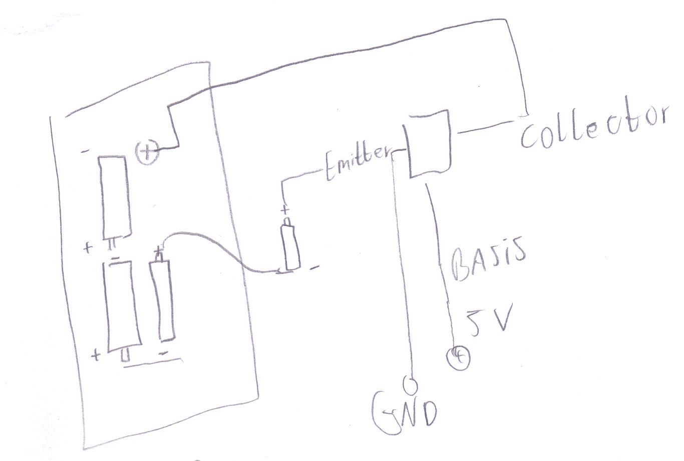Ich habe einfach mal die eine Batterie raus gelassen. Sprich: Vom Hauptminus in den Emitter und dann vom Collector an den Pluspol des Batteriefaches wobei dieses Pluspol wieder mit einem Minuspol der anderen Batterie verbunden ist...