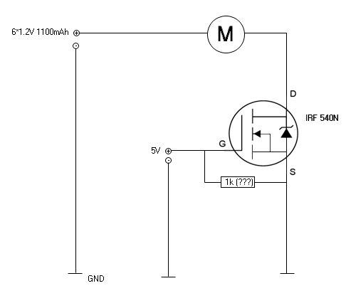 Ja wie gesagt: Gate ist angeschlossen an 5V. Gate ist mit 1k an Source angeschlossen. Source ist angeschlossen an Minus des Batteriefaches. Source ist anegschlossen mit GND der Steuerspannung (5V GND) Drain ist angeschlossen mit dem Motor. Plus des Batteriefaches geht zum Rotenkabel des Motors und Schwarzeskabel des Motors geht in Drain. Stimmt das soweit ?