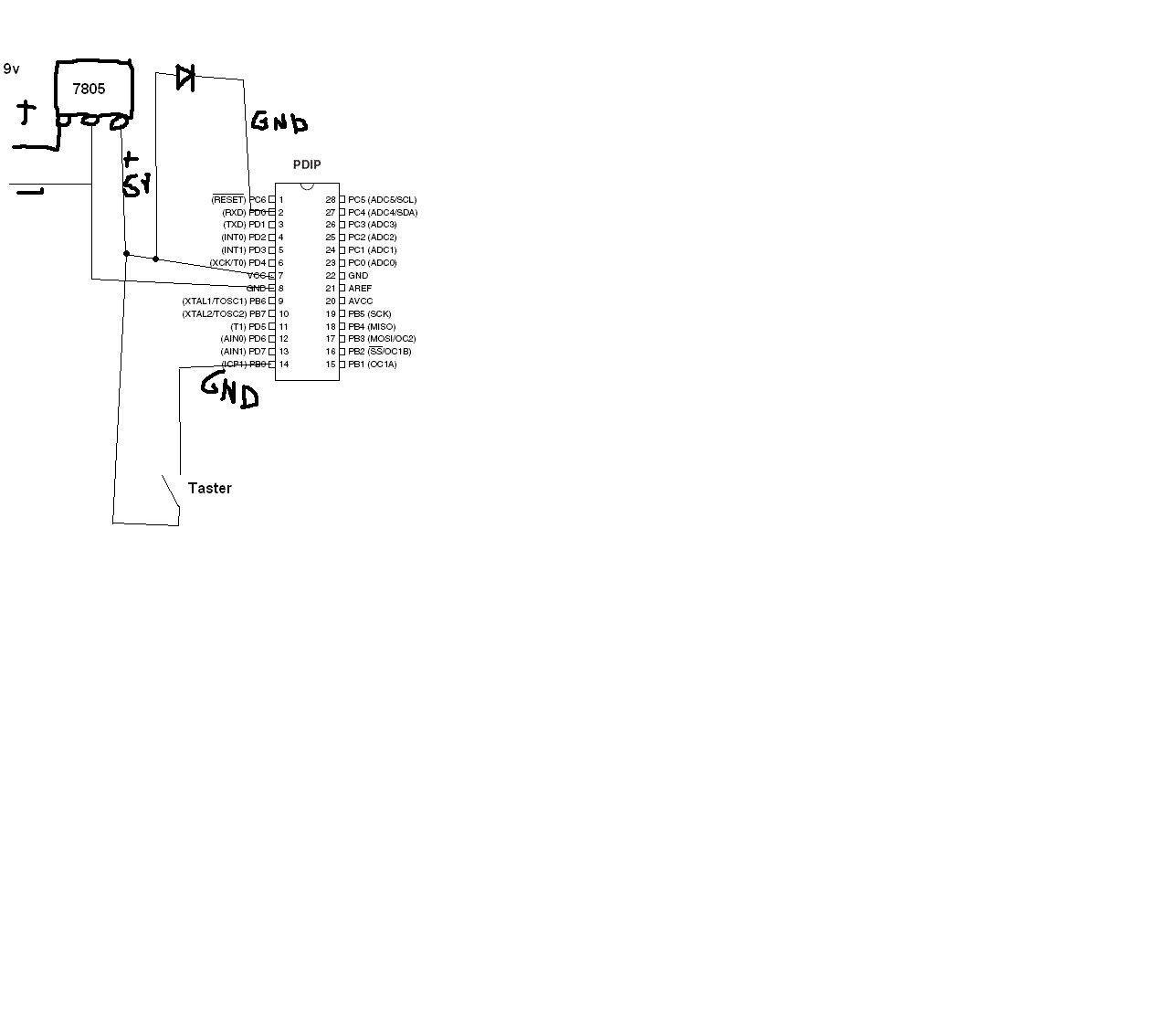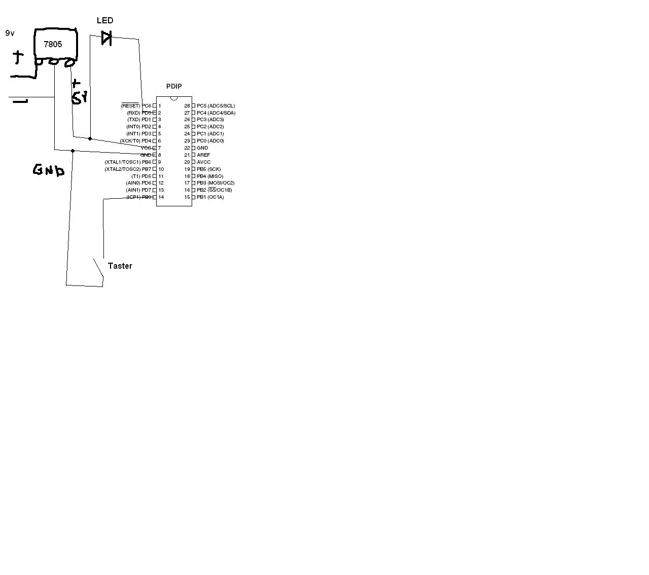 Es ist doch nicht schwer eine Skizze anzuhängen... das kann man mit ganz primitiven Mitteln machen, wenn man Angst vor einem Schaltplaneditor hat... (Edit: Sehe gerade, dass du eine Skizze angegeben hast) Dein Programm würde mit der Hardware im Anhang (Edit: mein Anhang) funktionieren. Die Widerstände dienen zur Strombegrenzung und damit dem Überleben der Bauteile. Die Schaltung ist auch im Tutorial erklärt http://www.mikrocontroller.net/articles/AVR-Tutorial:_IO-Grundlagen Bei > LED ist mit der Kathode zum controller geschaltet wäre die LED low-aktiv (Leuchten bei PORTD.0 0 und Dunkelheit bei PORTD.0 1) geschaltet. Wichtig ist, womit die Anode ("langes Beinchen") verbunden ist. Es sollte über einen Vorwiderstand eine Spannungsquelle sein, damit es funktioniert. Bei einer Verbindung Anode zu GND leuchtet diese LED nie. Bei > der Taster hat minus am Controller und plus beim 7805 baustein (5v)] liegt bei offenem Taster an PINB.0 0 an und bei geschlossenem Taster 1. So kann die LED nicht aus gehen, weil die if-Abfrage nicht erfüllt ist. Wenn deine (unbekannte) Schaltung bei offenem Taster die LED leuchten lässt, ist das nicht mit dem Programmcode und deiner Beschreibung ("LED ist mit der Kathode zum controller") in Einklang zu bringen. Dieses Verhalten wäre erklärbar, wenn die Anode der LED zum Controller und die Kathode zu GND (bzw. dem Vorwiderstand) verbunden ist und damit die LED high-aktiv geschaltet ist. Edit: Dein Taster kann keinen 0 Pegel herstellen, weil er keine Verbindung zu GND schafft. Zum Glück, denn ohne Widerstand würde eine Verbindung zu GND einen Kurzschluss bedeuten.