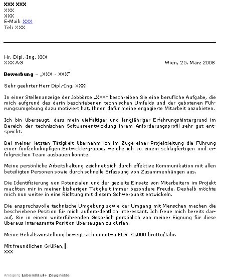 @bewerber Ohne jetzt auf jeden Satz eingehen zu wollen, finde ich die Bewerbung ganz OK. Hier ein paar Verbesserungsvorschläge (alles ganz subjektiv): 1.) Lass den ersten Absatz weg. Du erzählst dem Personaler nichts was er schon wüsste. Wenn Du Dich für die Stelle nicht interessiert hättest, würdest Du nicht schreiben, oder? Woher Du die Anzeige kennst kannst Du auch mit in die Betreffzeile schreiben (Bewerbung auf Anzeige soundo von daoderda). Außerdem schreibt so ein Einleitungssatz fast jeder. Nutze den Platz lieber für einen direkten Einstieg mit Informationen über Deine Person, die dem Personaler die Möglichkeit geben Dich als den idealen Kanditaten einladen zu wollen. 2.) Ich kenne jetzt die genaue Formulierung der Stellenanzeige nicht, darum eher grundsätzlich: Richte Deine Anzeige soweit wie möglich immer nach den geforderten Skills der Stellenanzeige aus. Versuche inhaltlich das Gewünschte abzudecken. Als Software-Gruppenleiter schreibst Du z.B. wenig über Deinen Software-Background, der ja wahrscheinlich von der Stelle gefordert wird. Fazit: Alles in allem eine ordentliche Bewerbung, die aber irgendwie "austauschbar" wirkt. Wie gesagt ich kenne jetzt nicht die Anzeige, aber ich finde, dass Sie nicht genug auf das Unternehmen bei dem Du Dich bewirbst eingeht. MfG QMler
