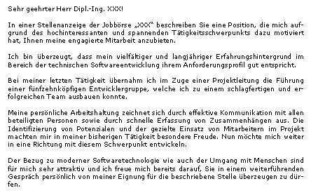 Gehört nur bedingt hierher, aber ich stelle hier mal frecherweise ein Anschreiben für eine für mich sehr wichtige Bewerbung als Software Gruppenleiter hinein, in der Hoffnung, Resonanz bezüglich der Brauchbarkeit des Anschreibens zu erhalten: *) ist dieses Anschreiben konkurrenzfähig ? *) fehlen wesentliche Dinge ? *) ist was zuviel drin? *) zu kurz und oberflächlich ? *) stilistisch gut oder sch... ? Ich bin schon zu sehr betriebsblind, um mir die Reaktion eines Personalchefs darauf vorstellen zu können. Man sagt ja, mehr als 6-8 Sätze sollen es nicht sein, alles was darüber hinaus geht, langweilt den Leser nur. Bringe ich mit mit diesen wenigen Sätzden überhaupt rüber was ich kann und will? Bitte um Verbesserungsvorschläge und konstruktive Kritik. ;-)