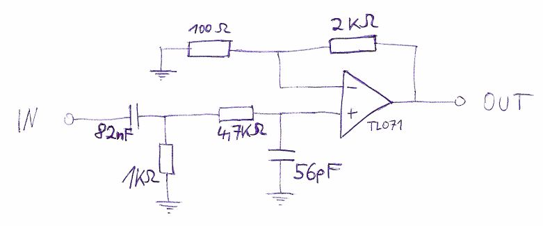 Allerdings hat der TL07x da nicht mehr viel zum Verstaerken und wirkt schon selber als Tiefpass in dem Frequenzbereich um 0.6Mhz. Deshalb koennte man den RC-Tiefpass auch wegfallen lassen. Gruss Helmi