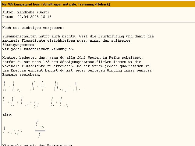 Was heist Relikte rumschleppen. Find es etwas arrogant vorauszusetzen das alle immer die neueste Software (die ja leider mitunter auch neue Hardware bedingt) vorhanden ist. Ich bin desöfteren an verschieden und eben auch älteren Rechnern online. Da ist es ärgerlich das dann mitunter statt Formeln nur Müll angezeigt wird. Wie oben gesagt ging es ja mal, ich denke die Info in einem Forum ist wichtiger als schickes Layout.