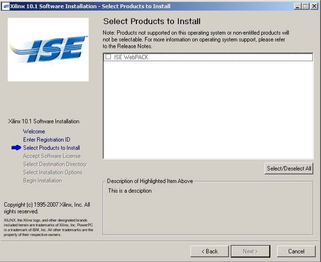 Hallo! Ich habe gestern versucht das Xilinx Webpack 10.1 zu installieren. Leider ohne Erfolg, da ich keine Auswahl beim Installationsmenü treffen kann (checkbox lässt sich nicht aktivieren). Ich hab ein Bild angehängt das den Installscreen zeigt. Irgendwie habe ich den Verdacht dass es an meinem Windows XP home scheitert. Hat vielleicht jemand das Webpack 10.1 unter xp home am laufen? Ich hatte das Webpack eintzeln heruntergeladen aber auch die Online- Installationsvariante versucht. Über das Online-Install lassen sich alle anderen Tools (60 days trials)aktivieren, jedoch auch hier das Webpack nicht. Bin für jede Hilfe dankbar! Grüße, Michael