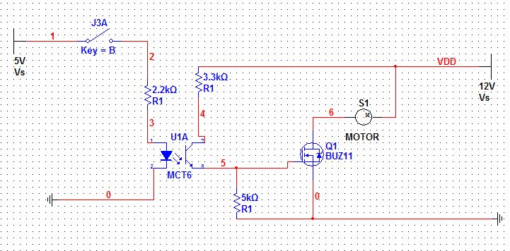 Also, mit einem optocoupler Schalte ich das Gate des Buz auf die 12V (3,3 Kohm wegen dem opto). Der Motor Sitzt zwischen + und Drain. Source liegt an -. Noch ohne PWM, aber der optocoupler ist da um die Stromkreise zu Trennen, damit ich mir keine Gedanken um Störungen durch den Motor, für den Rest machen muss...