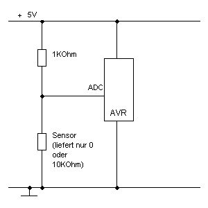 Da die Schaltschwelle der Eingänge der ATmegas bei 1,4V bis 1,8V liegt (VCC=5V), kannst du den oberen Widerstand auch noch etwas vergrößern, z.B. auf 3,3kOhm. Das ergibt einen High-Pegel von immer noch 3,8V, was völlig ausreichend sein sollte, und man reduziert den ständig durch Widerstand und Sensor fließenden Strom auf 1,5mA. @Bruno: Datenblatt scheint es keins zu geben, da der Sensor nicht für Basteleien, sondern für den Anschluss an eine Gardena-Steuerung gedacht ist.