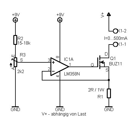 Hallo Dirk, wenn Du keinen großen Anspruch an die Konstantstromquelle hast, probier mal diese Schaltung mit Standardbauteilen aus, funktioniert ganz gut. Es sind auch weniger Bauteile notwendig. Der LM358 braucht auch nur eine pos. Spannung, keine zus. negative. Zwischen +9V und GND auch einen 100nF am LM358 platzieren, und evtl. nocht zusätzlich einen Siebelko, 100µ o.ä. Wenn man keine 9V zur Verfügung hat, kann man auch 12 oder 16V nehmen, allerdings ist dann R2 neu zu berechnen. Wie hoch ist die Last? Danach richtet sich hier V+. Als BUZ11 kann auch ein anderer MosFet verwendet werden, je nach Auslegung. Gruß