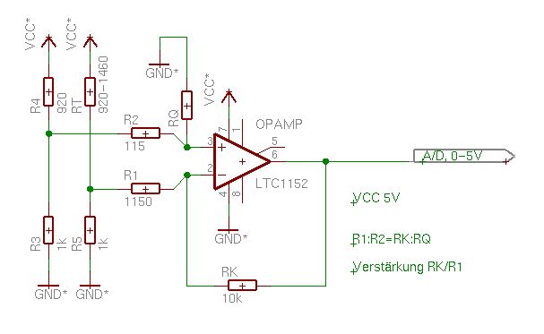 Ich habe nur eine Versorgungsspannung von +5V und GND(0V). Deshalb verwende ich einen Rail-to-Rail-Op dem eine rein positive Spannung ausreicht um ueber den gesamten Bereich zu arbeiten. Ich muss einen variablen Widerstand von 920 Ohm bis 1450 Ohm auf den Bereich 0V bis 5V abbilden um den nachfolgenden A/D-Wandler moeglichst gut ausnutzen zu koennen. Den OpAmp wollte ich als Differenzverstärker beschalten, da ich dadurch direkt ein Offset auf GND (durch die Differenzbildung) wegbekommen kann und dann mit dem Verstärkungsfaktor den Maximalwert auf 5V bekommen kann. (so habe ich mir das zumindest ausgedacht) Im Anhang habe ich mal meine Schaltung angehängt. (habe bei Eagle keinen OpAmp gefunden mit invertierendem Eingang oben, deshalb sieht das etwas seltsam aus) Mein Problem ist dabei RQ, der ja in Reihe mit R3 nach GND geht und ausserdem ist da noch R2 "auf dem Weg zu GND" dazwischen. Und R2+R4 gehen sogar noch gegen VCC...meine Frage also: Geht das überhaupt mit nur einem OpAmp (die Rail-to-Rail-Amps kosten ab 5euro aufwärts weshalb ich da ungern mehrere von einsetzen möchte) ? Wie ist die Schaltung richtig bzw. wie muss ich die Berechnungen anpassen ? Ich will das ungern durch herumprobieren lössen sondern lieber "sauber mathematisch". Lars.