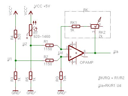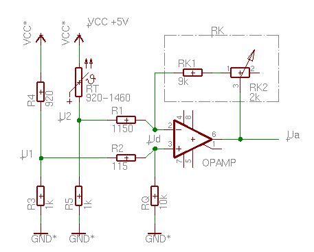 Hallo Lars, ich würde das Problem wie folgt (mathemathisch lösen: U1 = R3/(R3+R4)*5V = 1k/1,92k*5V = 2,604V U2 = R5/(R5+RT)*5V = 1k/2,46k*5V = 2.032V Differenz = 0,572 V Ua = RK/R1* UD R1 = 10k --> RK = R1* Ua/UD = 10K*5V/0,572V = 87,41K Für die Realisierung von RK würde ich einen 86k Festwiderstand und ein Poti mit 2k5 nehmen. Widerstand RQ kann entfallen