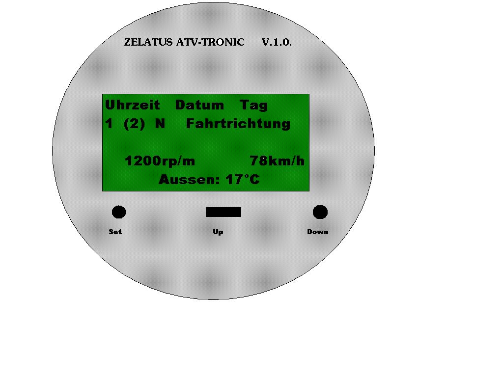 Hallo Ichbrauche eure hilfe. Folgendes, zurzeit mache ich mit yamaha (vielleicht sagt euch das was) ein projekt. Ich soll ein Unversal-atv konstruieren. Das ist sozusagen ein motorrad mit 4-räder (für alle die sowas nicht kennen). Naja, alles ist fertig nur der Bordcomputer fehlt noch. Er soll ein ca. 10x10cm großes grafikdisplay haben und mit 3 Taster steuerbar sein. Stromversorgung 12V. Er sollte folgende funktionen haben: - Außentemperatur, Öltemp. und Kühlwassertemp. - Tachometer und Drehzahlmesser - Uhrzeit und Datumsanzeige - Ganganzeige - Fehler anzeigen (z.b. Kühlwasser zu heiß oder lichtmaschiene defekt) - diverse kontrollsymbole anzeigen ( abblender-scheinwerfer und blinker rechts links) -watungsanzeige -was euch noch so einfällt Alle funktionen müssen mit den drei tastern aufrufbar sein. Im anhang findtet ihr einen entwurf der standardanzeige des displays. Vielen dank