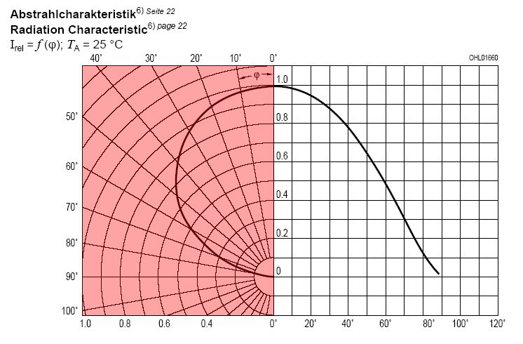 Also um kurz wieder zu der Größe des Zylinders zurück zukommen: Ich habe jetzt folgendes genommen. Auf der Seite 7 des Datenblats (siehe Anhang) habe ich folgende werte abgelesen. im Winkel von 30° wird 80% aller Leuchtkraft abgestrahlt? Ist das richtig? Dann habe ich mit tan alpha = Gegenkatete/Ankatete genommen. Winkel zum aurechnen: 90°-30° = 60° tan 60 * 4mm (Zylinderdurchmesser) = ca. 7mm (Zylinderhöhe) d.h. mein Zylinder darf 7mm hoch sein, damit die Leuhkraft ca. 80% ist? Ist das richtig. Bin mir nicht sicher ob diese Überlegung richtig ist!