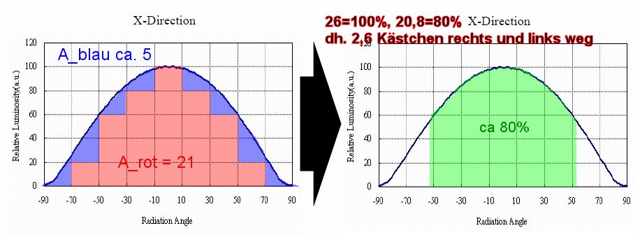 Wie wär's mit dem entsprecheden Datenblatt? z.B: für eine Luxeon 1W http://www.produktinfo.conrad.com/datenblaetter/175000-199999/176290-da-01-de-Luxeon_Led_1W_StarHexagon_LXHL-MB1D.pdf Stichwort "Raumstrahlungsmuster"