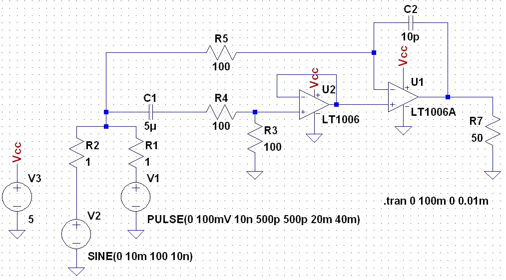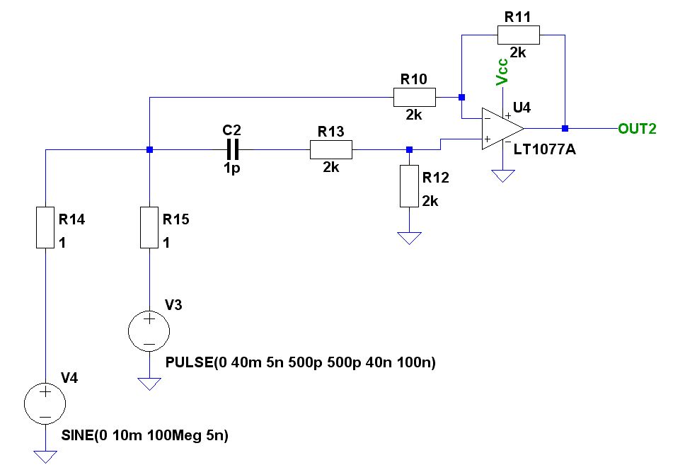 Michi wrote: > Versorgungsspannung 5V, der OP ist für Single supply geeignet. Am > Ausgang der Schaltung sehe ich allerdings immer nur das Signal das am > invertierenden Eingang des OPs anliegt. Also, erstmal steuerst Du Deine Eingänge zu stark zum Rand aus. Leg mal R12 nicht in Richtung - sondern auf ein höheres Potential. Ganz billig kannst Du das machen, in dem Du 1-2 LEDs in Reihe (mit Vorwiderstand) betreibst, und dann die Spannung an den LEDs abgreifst. Die sollte so etwa 2 Volt oberhalb deiner Masse sein, oder nimm für die Simulation 2 1mOhm Wiederstände als Spannungsteiler. Schalte dann auch deine Quellen in Reihe geschaltet sein. Auch Dein Hochpass unten am nicht-invertierenden Eingang erscheint mir sehr zweifelhaft. Hast Du den wirklich für deine Frequenzen durchgerechnet? Mir erscheinen auch die 100MHz für Dein "Tieffrequentes Störsignal" etwas hoch. Was ich machen würde, wäre erst einmal ein Hochpass, zumindest wenn Du Dir erlauben kannst, auf den Gleichspannungsanteil zu verzichten, und dann ein Schmidt-Trigger. Ist Dein Digitalsignal Gleichanteilsfrei? Nur wenn Du das hinkriegst kannst Du überhaupt tieffrequente Signale herausfiltern.