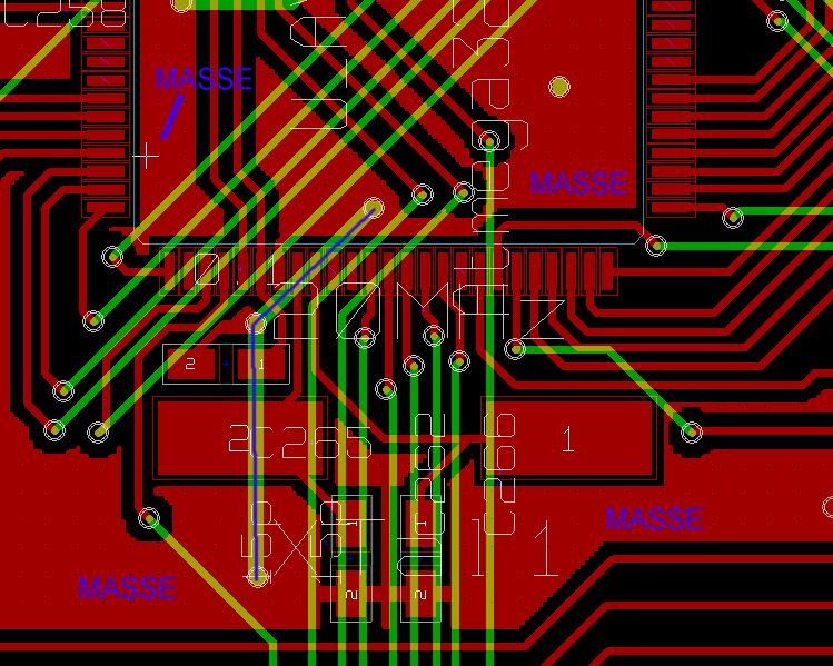 Hallo Jörg, die Masseführung ist auf dem Bild ersichtlich. Bezeichnungen: Leiterbahnen auf der Bestückungsseite: rot Leiterbahnen auf der Rückseite: grün Vias: weiße Kreise. Nicht gezeigt sind die Flächen auf der Rückseite, tatsächlich wird die grüne Leitung mit dem blauen Streifen zu einer recht breiten Massefläche auf der Rückseite. Es ist ein Prototyp, der von Hand gelötet wird -- die Vias unter dem uC stören mich deshalb nicht! 73 Fred dk4bc