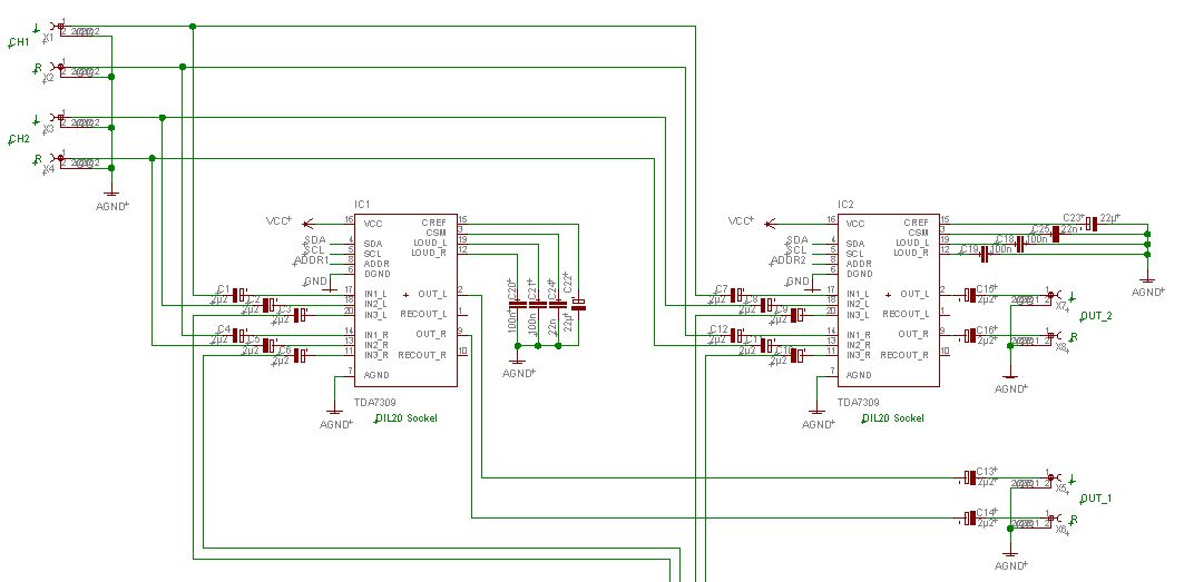 4 Räume sollen unabhängig voneinander unter 3 Stereo Quellen auswählen können. Das ganze dann noch mit Lautstärkesteuerung. Dafür habe ich 4 TDA7309 vorgesehen. Beim Layout bekomme ich jetzt aber so langsam Probleme weil der Platz nicht reicht. Daher würde ich gerne einige Elkos einsparen. Könnte man die Schaltung (siehe Auszug im Anhang) so ändern das nur direkt an den Eingängen die Elkos sitzen und die ICs alle direkt miteinander verschaltet sind? Die Tonqualität muss nicht perfekt sein, nur knacken oder plötzliche Pegelsprünge sollte es nicht geben.