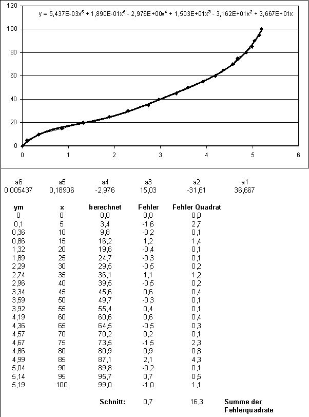 schon eher. Durch "visuelles Probieren" bin ich auf a=6 und b=6.5e-4 gekommen. Die Funktion ist relativ leicht zu berechnen (auf jeden Fall leichter als ein Polynom 6ten Grades), und der Approximationsfehler könnte noch halbwegs in der Größenordnung der Messfehler liegen. Die Ergebnisse im Vergleich (ym: gemessen, ya: approximiert): x ym ya Fehler 0 0.00 0.00 0.000 5 0.10 0.10 -0.004 10 0.36 0.37 0.006 15 0.86 0.77 -0.094 20 1.32 1.24 -0.082 25 1.89 1.73 -0.157 30 2.29 2.21 -0.075 35 2.74 2.66 -0.080 40 2.96 3.06 0.099 45 3.34 3.41 0.070 50 3.59 3.71 0.124 55 3.92 3.98 0.057 60 4.19 4.20 0.014 65 4.36 4.40 0.038 70 4.57 4.57 -0.004 75 4.67 4.71 0.041 80 4.86 4.84 -0.023 85 4.99 4.95 -0.043 90 5.04 5.04 0.002 95 5.14 5.13 -0.014 100 5.19 5.20 0.010