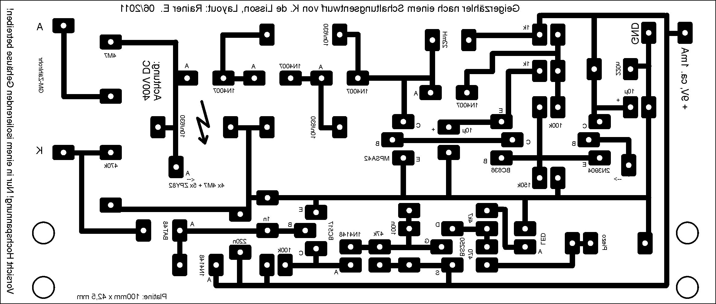 Hallo an alle "Zähler"! Durch Zufall bin ich auf dieses Forum und dieses Thema gestoßen. Das hat mich wieder an meinen vor vielen Jahren gebauten Geigerzähler (Schaltplan aus Elektor) erinnert. Dieser erzeugt die Hochspannung über einen "umgedrehten" Trafo und eine Kaskade und verbraucht dabei locker 300mA aus 12V. Um so mehr haben mich die hier gezeigten Schaltungen neugierig gemacht, wo eine die andere im Stromsparen übertrifft. Kurz entschlossen habe ich mir also bei Reichelt die Teile bestellt und die Schaltung von Klaus (kolisson) nachgebaut, welche er hier am 7.3.11 um 4:12 gepostet hat "Geiger_Lisson_mit_Auswertung-ver2.png". Diese Schaltung ist so gut wie perfekt, ich habe für mich nur noch ein paar kleine Ändeurngen vorgenommen: - Transistor Q1 durch MPSA 42 ersetzt, der 2sc3209 ist schwer zu bekommen - Für die Spule L1 habe ich eine mit 22mH genommen (Reichelt L-HBCC 22M) - C6 auf 100nF verringert (für kürzere Impulse), das reicht locker für die LED und einen Piezo-Schallwandler und verringert die Stromaufnahme nochmal deutlich. - R4 und R11 zusammengefasst zu 150k. - R15 habe ich durch 4k7 ersetzt, die LED blitzt noch immer kräftig genug und die Stromaufnahme wird so minimiert. Meine Schaltung wird aus einem 9V Block gespeist. - An den Ausgang der Schaltung habe ich einen Piezo Schallwandler ohne Elektronik (Reichelt: SUMMER BM 15B) gehängt. Damit dieser leise aber doch vernehmlich klickt, habe ich R16 auf 470R verringert, u.U. könnte man den Widerstand auch ganz weglassen. Die Z-Diode D12 habe ich wegrationalisiert, weil ich keine weitere Auswertung benötige. ..mit Mikrocontrollern hab ichs nicht so :-) Ich verwende zwar ein Valvo 18503 Zählrohr, aber das arbeitet bei der gleichen Betriebsspannung, somit sind dafür keine Änderungen nötig. Der Spannungswandler arbeitet bei mir mit ca. 20Hz und zieht damit alle 50ms impulsartig für wenige µs einen Strom von 50mA, unabhängig von der Zählrate. Mit einem größeren Elko am Eingang ließe sich das noch besser ausmitteln, aber der 9V Batterie dürfte es weitgehend egal sein. Über die Zeit gemittelt liegt die Stromaufnahme bei nur knapp 1mA! Danke an Klaus und alle, die hier so wertvolle Tips gegeben haben. Ich bin begeistert! :-) Falls die Schaltung jemand nachbauen will: Ich habe ein Platinenlayout gezeichnet, siehe Anhang. Mit 600dpi auf 100x42,5mm ausdrucken und in Kontaktbelichtung belichten. Nach dem Ätzen und vor der Inbetriebnahme die Platine im Hochspannungsbereich beidseitig mit Wattestäbchen und Alkohol reinigen, um die Kriechströme zu minimieren. Samit 9V Block und Zählrohr passt die Schaltung perfekt in ein handliches Gehäuse (Reichelt SP2512SW). Viele Grüße, Rainer