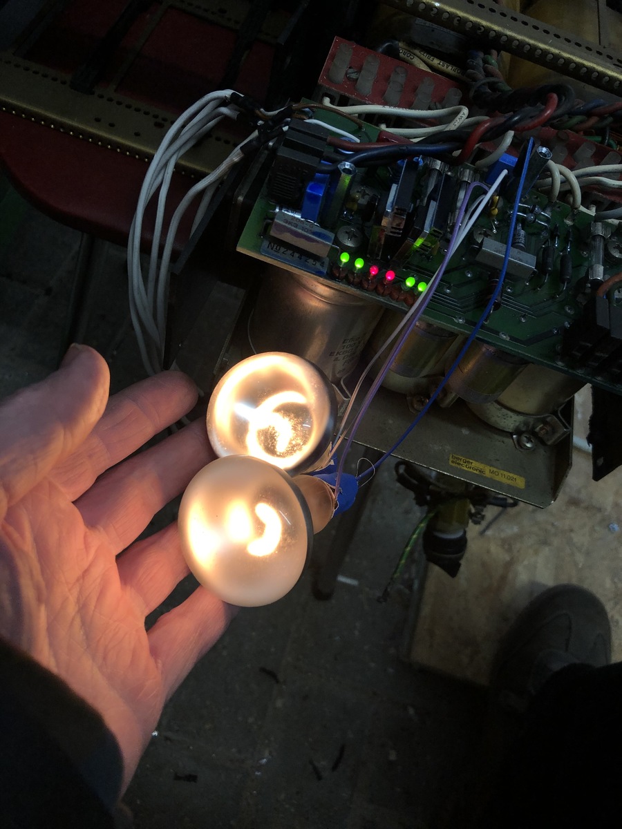 Ok, primär umgedreht und die Glühbirnen glimmen jetzt doch wesentlich schwächer. Ich würde jetzt die Karten und den ersten Motor anschließen, aber die Glühbirnen noch dran lassen, richtig?
