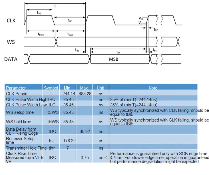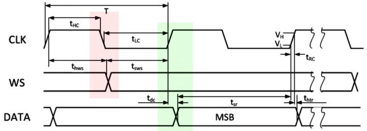 Ich habe Mikrofon mit I2S Philips konfiguriert und mit Oszilloskop den Wellenform geschaut. Die WS immer auf fallender CLK Flanke geändert werden, aber die Daten ist immer auf steigender CLK Flanke geändert werden. Es ist verwirrend.