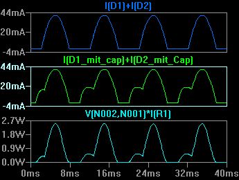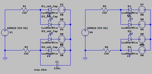 >wer nicht rechnen kann oder will sollte wenigstens mal simulieren. Eben. Und da siehst Du, dass die Helligkeit in der Stromverschobenen-Phase über beide LED-Reihen gemittelt vielleicht 10-20 % größer ist, als sie ohne Kondi wäre (schau auf den Leistungsverlauf, nicht den Stromverlauf) und ausgehen tut sie immer noch! Und das erkauft man sich dann durch extra-Belastung der Widerstände. Na dankeschön.